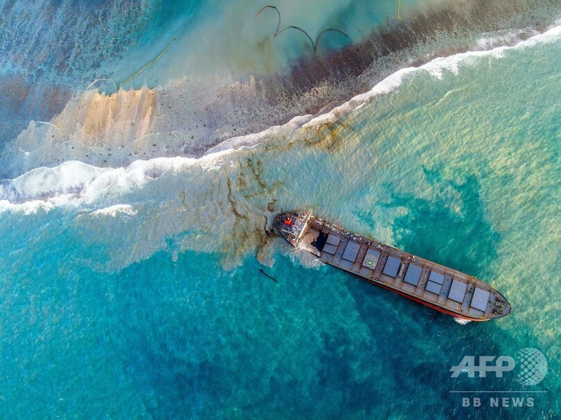 【8月25日 AFP】(写真追加)インド洋の島国モーリシャス沖で日本の貨物船が座礁し、燃料が流出した事故で、分断された船体の前方部を海中に沈めて処分する作業が無事完了した。国家危機対策委員会が24日、明らかにした。