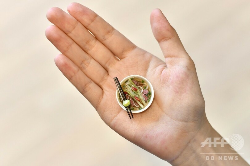 【11月7日 AFP】ベトナム人アーティストのグエン・ティ・ハー・アン(Nguyen Thi Ha An)さん(28)は目を細めて集中し、フォーの入ったわんに赤唐辛子を添える。わんの大きさは、硬貨よりかろうじて大きい程度だ。これは、アンさんが多くの時間を注いでいるミニチュア粘土細工を仕上げる様子だ。