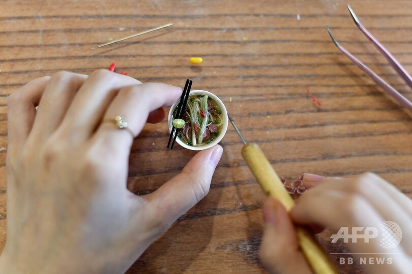 【11月7日 AFP】ベトナム人アーティストのグエン・ティ・ハー・アン(Nguyen Thi Ha An)さん(28)は目を細めて集中し、フォーの入ったわんに赤唐辛子を添える。わんの大きさは、硬貨よりかろうじて大きい程度だ。これは、アンさんが多くの時間を注いでいるミニチュア粘土細工を仕上げる様子だ。
