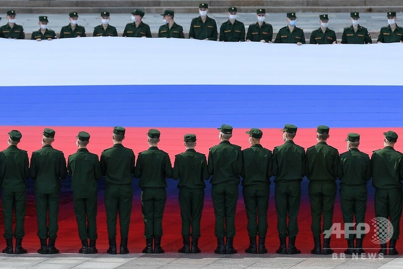 【9月1日 AFP】ロシア・モスクワのポクロンナヤの丘(Poklonnaya Hill)で行われた「国旗の日(National Flag Day)」を記念する式典で、軍人らが広げた巨大なロシア国旗。