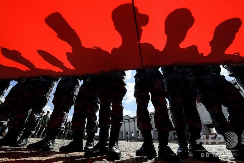 【9月1日 AFP】ロシア・モスクワのポクロンナヤの丘(Poklonnaya Hill)で行われた「国旗の日(National Flag Day)」を記念する式典で、軍人らが広げた巨大なロシア国旗。