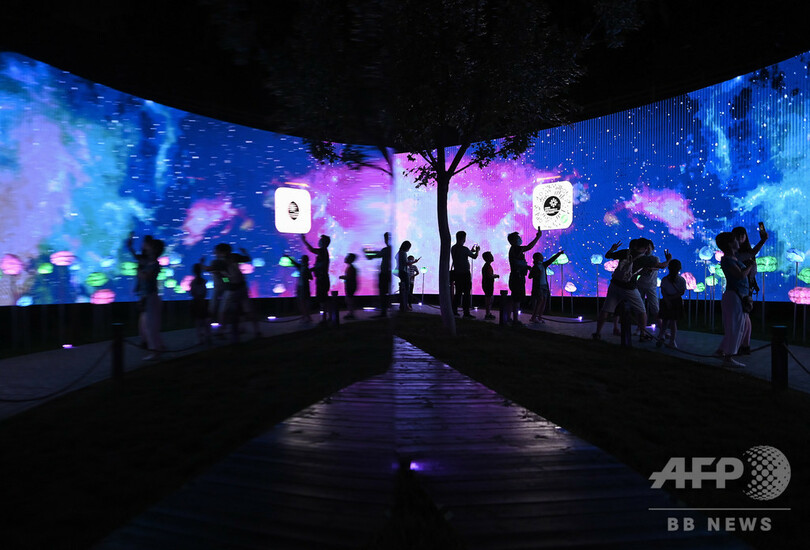 【9月3日 AFP】中国・北京の公園で開催された光の祭典「2020北京インターナショナル・ライト・フェスティバル(2020 Beijing International Light Festival)」で、屋外に展示された没入体験型作品の中でキスをするカップル。(c)AFP