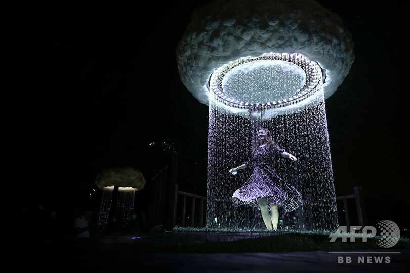 【9月3日 AFP】中国・北京の公園で開催された光の祭典「2020北京インターナショナル・ライト・フェスティバル(2020 Beijing International Light Festival)」で、屋外に展示された没入体験型作品の中でキスをするカップル。(c)AFP