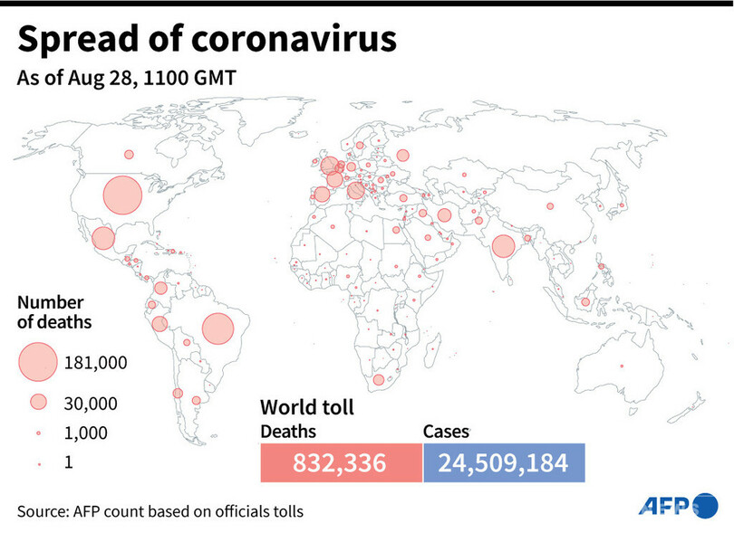 【8月29日 AFP】AFPが各国当局の発表に基づき日本時間28日午後8時にまとめた統計によると、世界の新型コロナウイルスによる死者数は83万2336人に増加した。