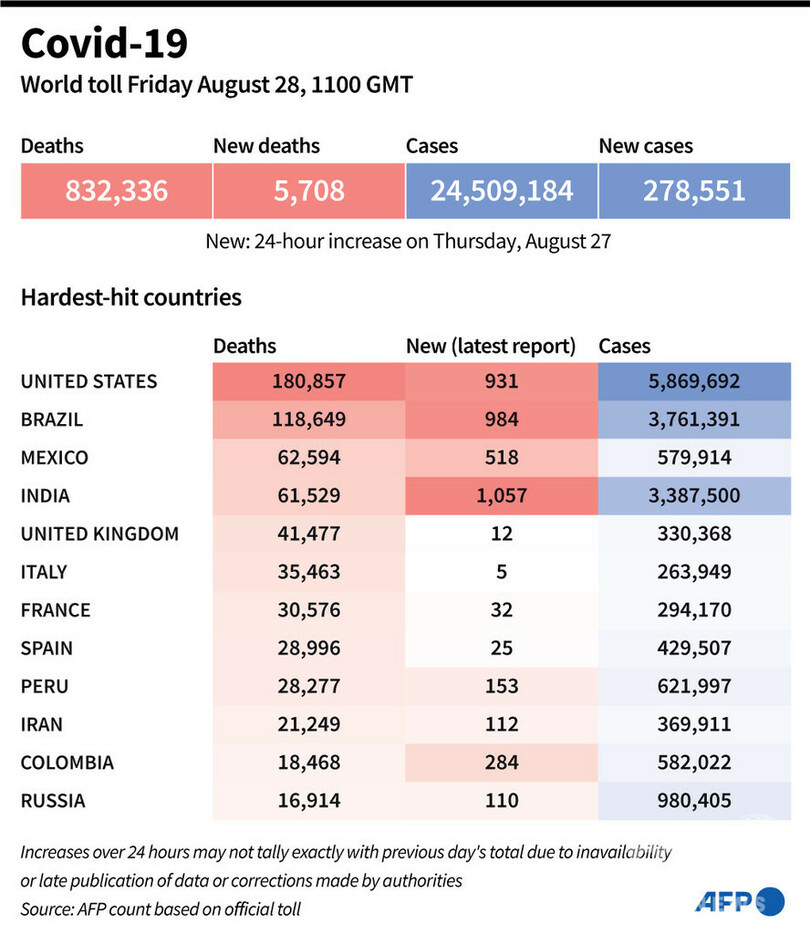 【8月29日 AFP】AFPが各国当局の発表に基づき日本時間28日午後8時にまとめた統計によると、世界の新型コロナウイルスによる死者数は83万2336人に増加した。