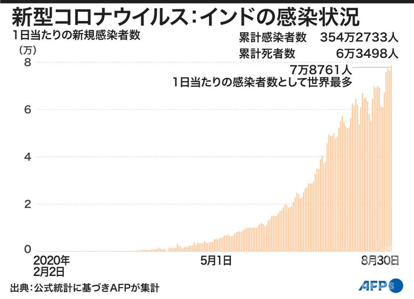 【8月30日 AFP】インドで30日、過去24時間で新たに7万8761人の新型コロナウイルス感染者が報告され、1日当たりの新規感染者数としては米国の記録を抜いて世界最多となった。保健・家族福祉省の統計で判明した。