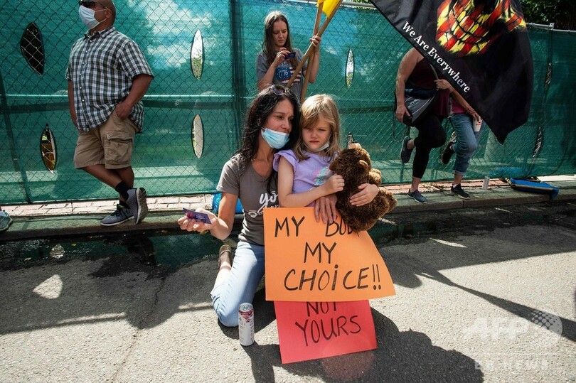 デモの参加者の中には、ドナルド・トランプ(Donald Trump)大統領の再選を訴える横断幕を掲げる人や、陰謀論を唱える極右グループ「Qアノン(QAnon)」を示すQの文字がプリントされたTシャツを着ている人もいた。
