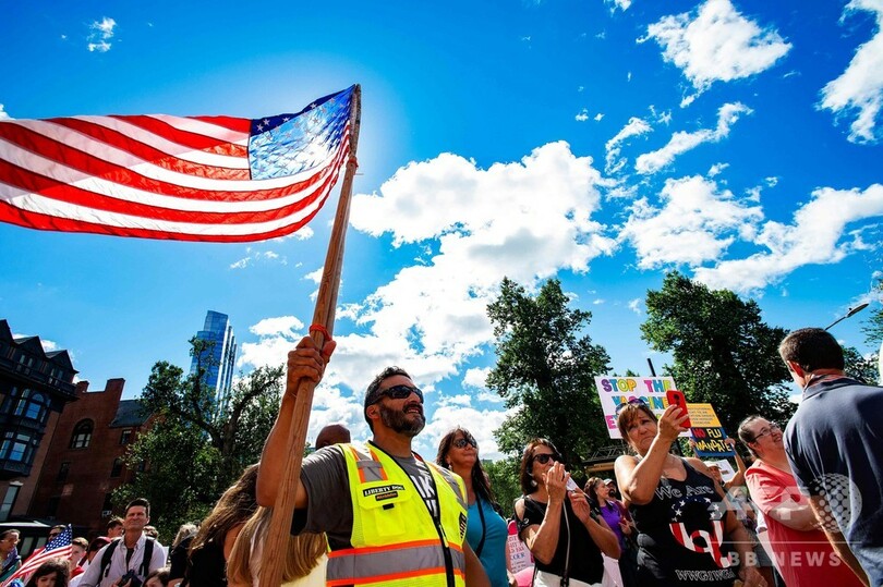 デモの参加者の中には、ドナルド・トランプ(Donald Trump)大統領の再選を訴える横断幕を掲げる人や、陰謀論を唱える極右グループ「Qアノン(QAnon)」を示すQの文字がプリントされたTシャツを着ている人もいた。
