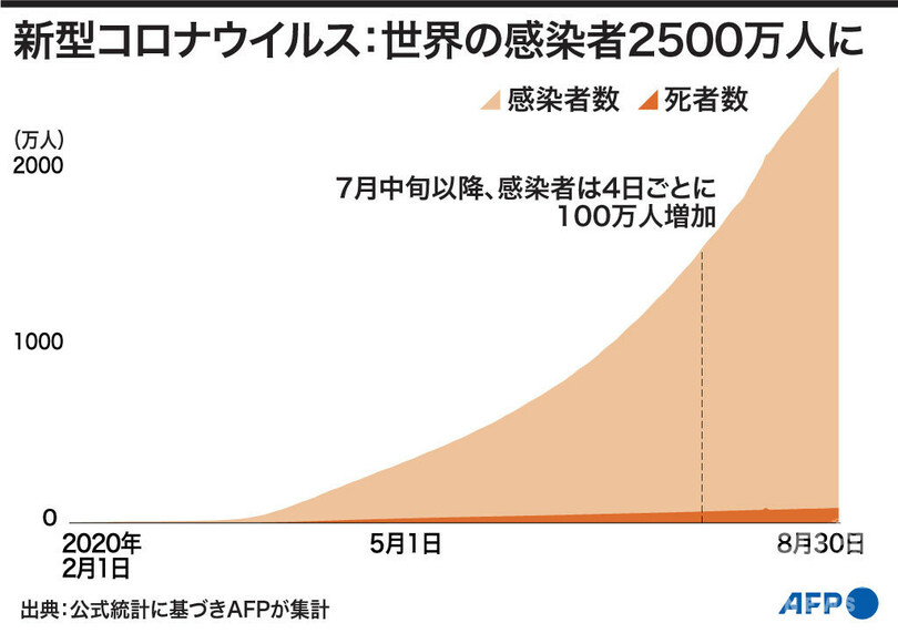 【9月1日 AFP】AFPが各国の公式発表を基にまとめた統計によると、新型コロナウイルスの世界の感染者数が8月30日の時点で2500万人を超えた。7月中旬以降は、4日ごとに約100万人のペースで増えているという。(c)AFP