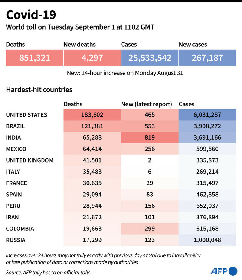 【9月2日 AFP】AFPが各国当局の発表に基づき日本時間9月1日午後8時にまとめた統計によると、世界の新型コロナウイルスによる死者数は85万1321人に増加した。