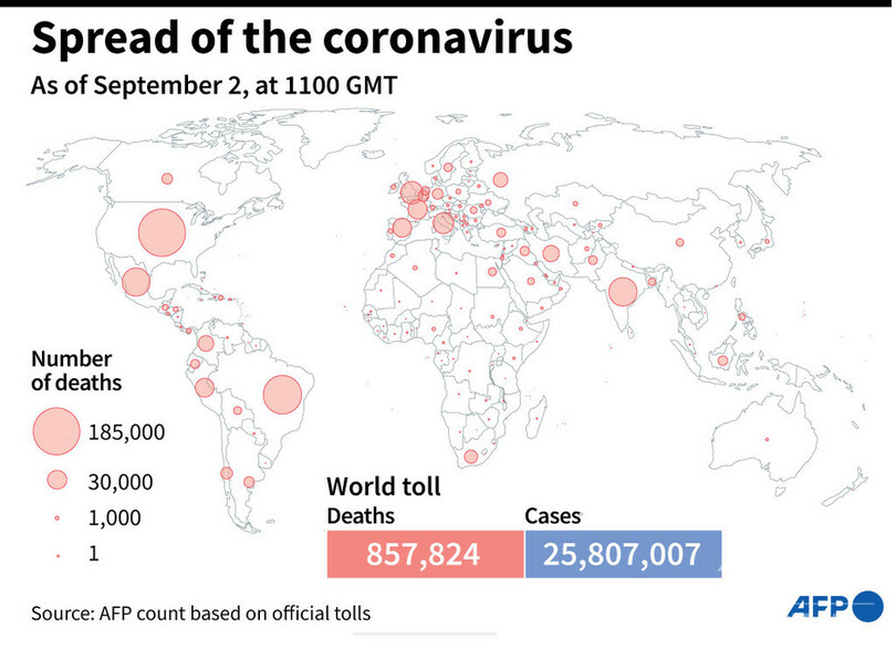 【9月3日 AFP】AFPが各国当局の発表に基づき日本時間9月2日午後8時にまとめた統計によると、世界の新型コロナウイルスによる死者数は85万7824人に増加した。