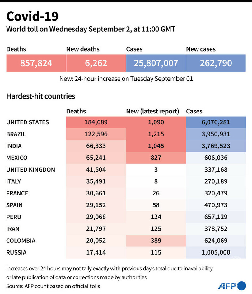 【9月3日 AFP】AFPが各国当局の発表に基づき日本時間9月2日午後8時にまとめた統計によると、世界の新型コロナウイルスによる死者数は85万7824人に増加した。