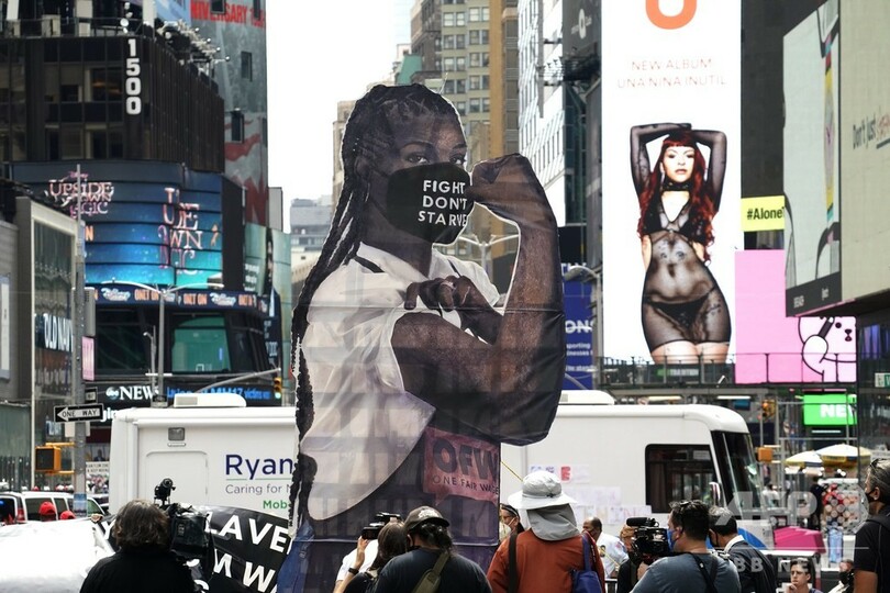 【9月12日 AFP】新型コロナウイルスの感染が拡大する中、チップ制労働者の適正賃金を求める街頭運動として、約7メートルの木製の看板「エレナ・ジ・エッセンシャルワーカー(Elena the Essential Worker、生活維持に不可欠な労働者のエレナの意)」が公開された。米ニューヨークのタイムズスクエア(Times Square)で。(c)AFP