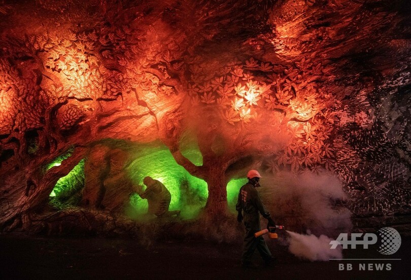 【9月15日 AFP】コロンビア・ボゴタから北へ45キロのシパキラ(Zipaquira)で、新型コロナウイルスの感染が広がる中、岩塩坑内の地下教会「塩の大聖堂(Salt Cathedral)」を消毒する作業員。同国の観光名所である塩の大聖堂は、再開に向けて保健省の許可を待っている。(c)AFP