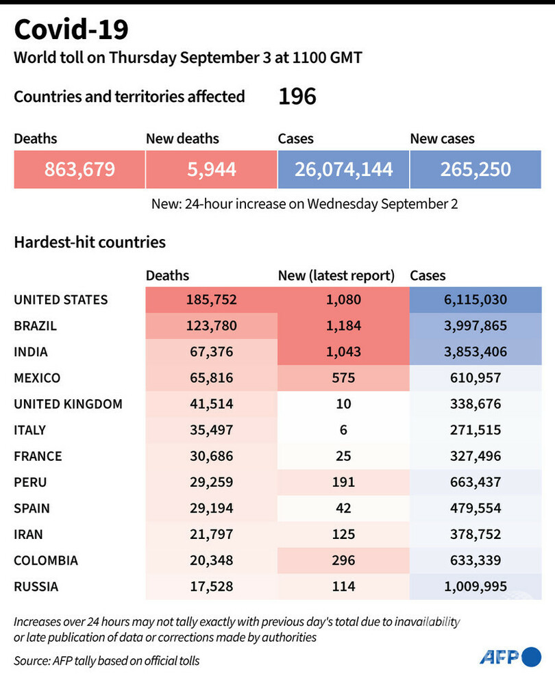 【9月4日 AFP】AFPが各国当局の発表に基づき日本時間9月3日午後8時にまとめた統計によると、世界の新型コロナウイルスによる死者数は86万3679人に増加した。