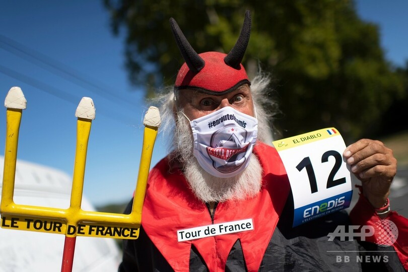 【9月5日 AFP】ツール・ド・フランス(2020 Tour de France)第7ステージ(ミヨーからラバール、168キロメートル)が行われた4日、沿道に「悪魔おじさん」の通称で知られる自転車デザイナーのディディ・ゼンフト(Didi Senft)さんが登場し、選手たちに声援を送った。(c)AFP