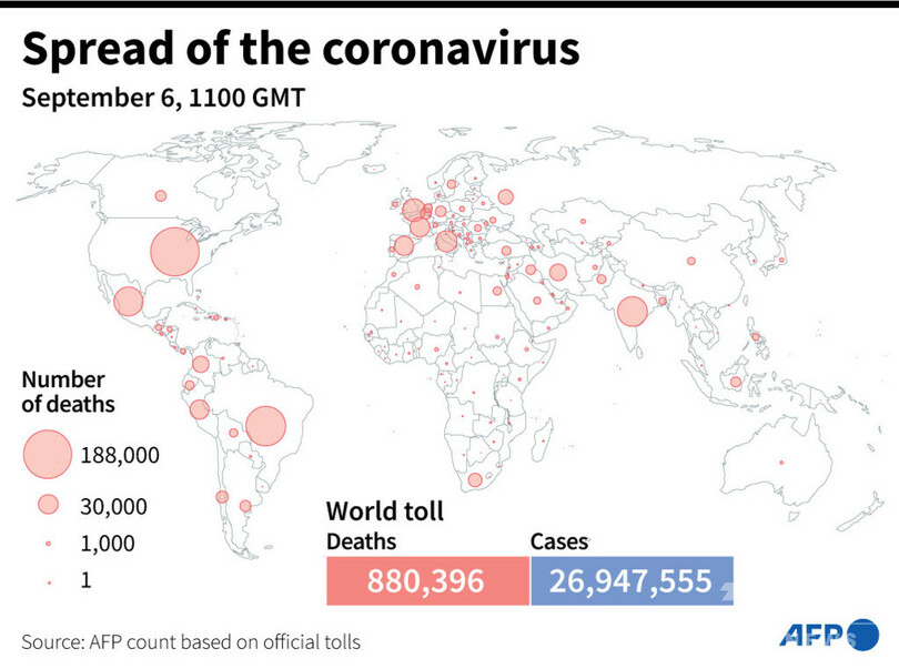 【9月7日 AFP】AFPが各国当局の発表に基づき日本時間6日午後8時にまとめた統計によると、世界の新型コロナウイルスによる死者数は88万396人に増加した。