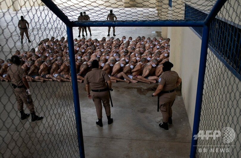 房内では同国の2大ギャング勢力であり、対立する「マラ・サルバトルチャ(Mara SalvatruchaMS-13)」と「バリオ18(Barrio 18)」のメンバーらが一緒に、詰め込まれるように収監されていた。受刑者らは全員、上半身裸に白いショーツ姿で、新型コロナウイルス対策としてマスクを着用している。