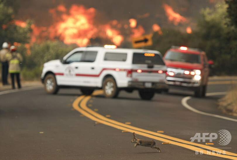 先週末以降、同州北部も山火事に見舞われている。火の手の急速な拡大により、フレズノ(Fresno)の北東部に位置するマンモスプール貯水池(Mammoth Pool Reservoir)付近に追い詰められた200人以上が、ヘリコプターで救出された。(c)AFP