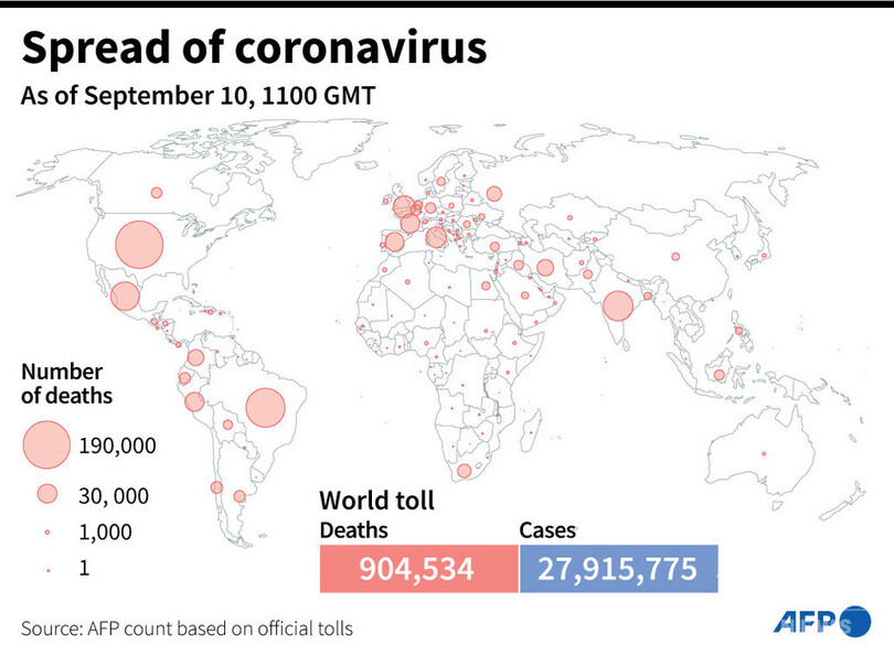 【9月11日 AFP】AFPが各国当局の発表に基づき日本時間10日午後8時にまとめた統計によると、世界の新型コロナウイルスによる死者数は90万4534人に増加した。
