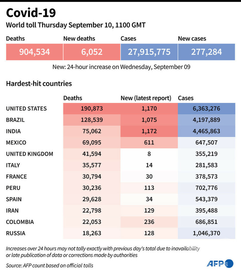 【9月11日 AFP】AFPが各国当局の発表に基づき日本時間10日午後8時にまとめた統計によると、世界の新型コロナウイルスによる死者数は90万4534人に増加した。