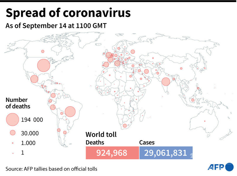 【9月15日 AFP】AFPが各国当局の発表に基づき日本時間14日午後8時にまとめた統計によると、世界の新型コロナウイルスによる死者数は92万4968人に増加した。