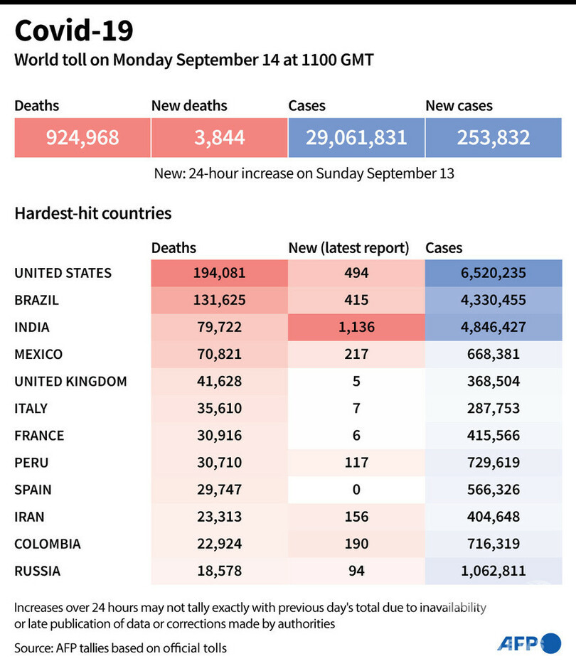 【9月15日 AFP】AFPが各国当局の発表に基づき日本時間14日午後8時にまとめた統計によると、世界の新型コロナウイルスによる死者数は92万4968人に増加した。