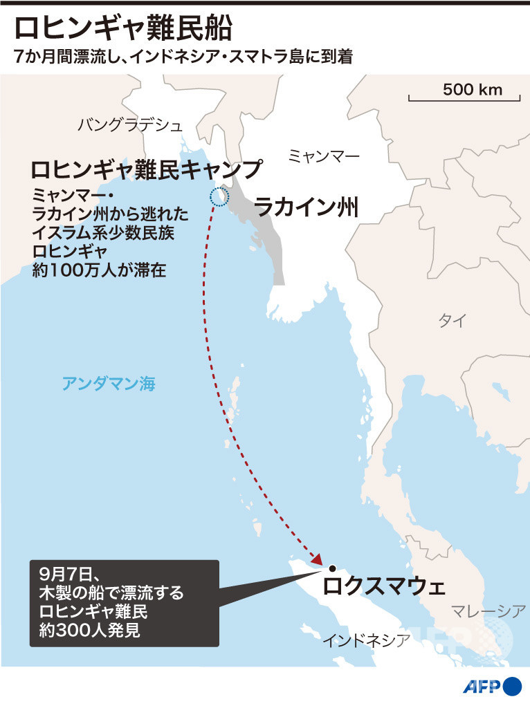 今回上陸した集団と、6月にインドネシアに上陸した100人近いロヒンギャの数から推測すると、今年3月ごろに約800人がバングラデシュで大型船に乗り、その後複数の小型船に分かれたとみられる。