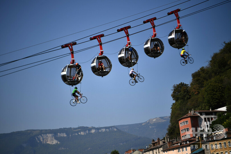 【9月19日 AFP】今年で107回目となるツール・ド・フランス(2020 Tour de France)第17ステージ、グルノーブル(Grenoble)からメリベルコルデラロゼ(Meribel Col de la Loze)までの170キロ間で、ケーブルカーの下に自転車ごとぶら下がるサイクリスト。(c)AFP