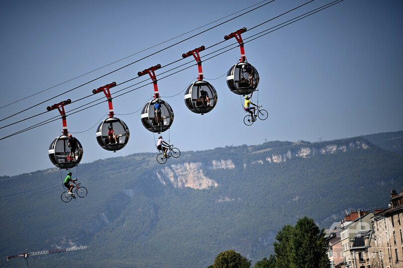【9月19日 AFP】今年で107回目となるツール・ド・フランス(2020 Tour de France)第17ステージ、グルノーブル(Grenoble)からメリベルコルデラロゼ(Meribel Col de la Loze)までの170キロ間で、ケーブルカーの下に自転車ごとぶら下がるサイクリスト。(c)AFP