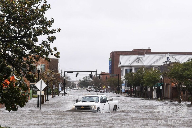 大規模な洪水被害に見舞われたフロリダ州ペンサコラ(Pensacola)では、繁華街の道路が冠水して湖のようになった。車はタイヤの上まで水に漬かり、猛烈な風が水面を波立たせた。