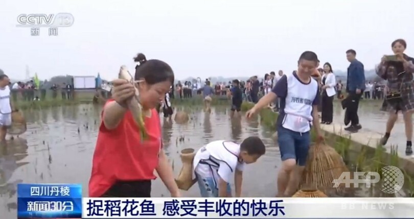 四川省(Sichuan)眉山市(Meishan)丹棱県(Danleng)では、田んぼでミナミメダカ捕りが行われています。成都市(Chengdu)や重慶市(Chongqing)から50世帯が参加し、収穫の楽しさを農家の人たちと一緒に体験しています。統計によりますと、従来の方法で稲の栽培をした場合は1ムーあたりの収入が1200元(約1万8000円)になりますが、ミナミメダカの養殖では、収入が4000元(約6万1000円)も増えるということです。(c)CGTN Japanese/AFPBB News