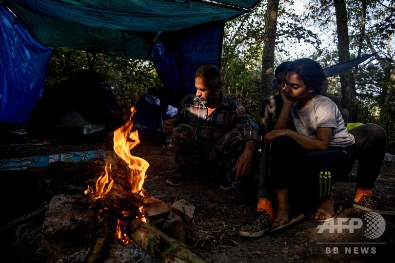 ワリドさんとファラさんは、グランドサントの鉄道近くの林に防水シートで仮のテントを設置し、携帯電話が鳴るのをじっと待っていた。