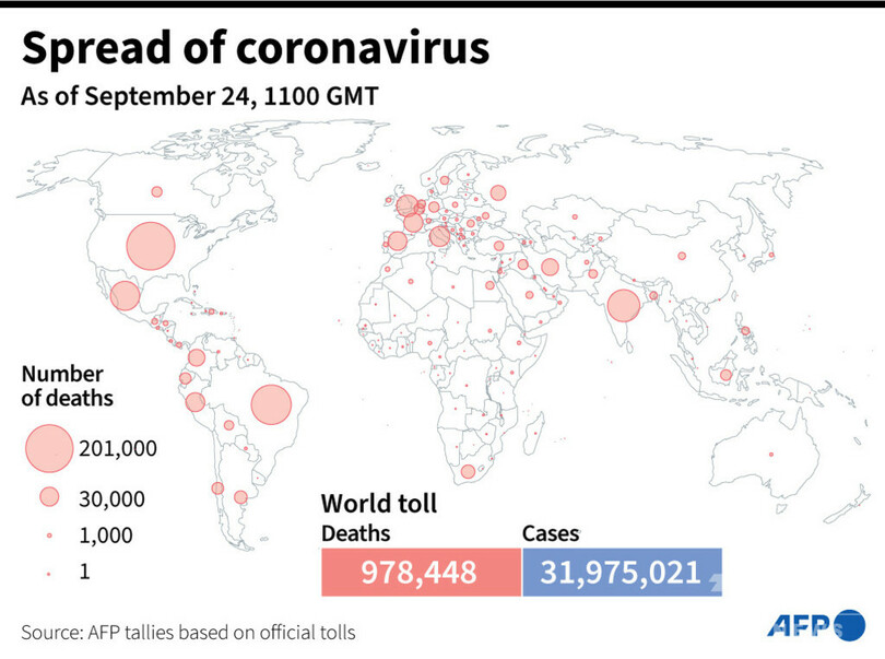 【9月25日 AFP】AFPが各国当局の発表に基づき日本時間24日午後8時にまとめた統計によると、世界の新型コロナウイルスによる死者数は97万8448人に増加した。