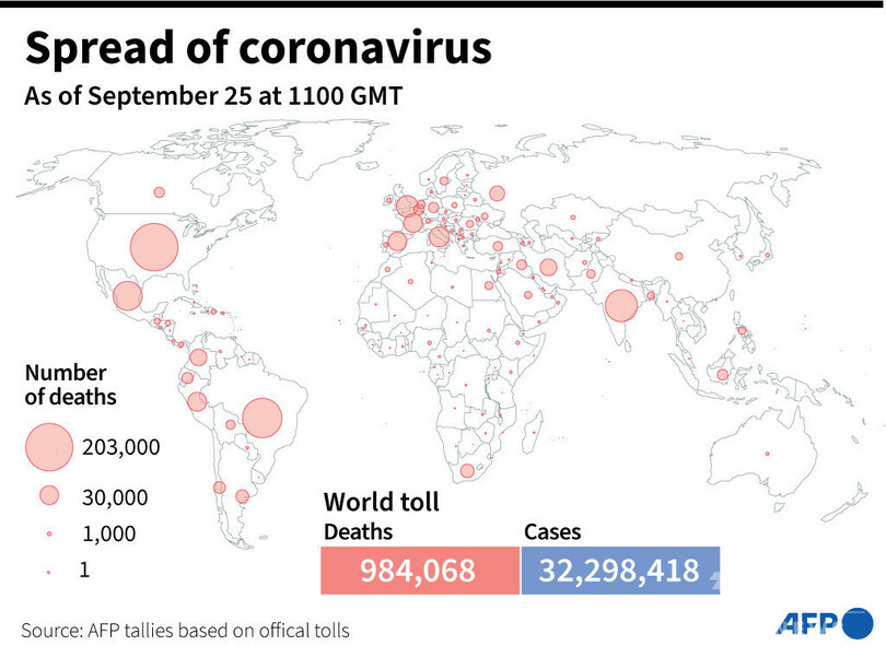 【9月26日 AFP】AFPが各国当局の発表に基づき日本時間25日午後8時にまとめた統計によると、世界の新型コロナウイルスによる死者数は98万4068人に増加した。