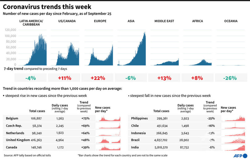 【9月26日 AFP】AFPが各国当局の発表に基づき日本時間25日午後8時にまとめた統計によると、世界の新型コロナウイルスによる死者数は98万4068人に増加した。