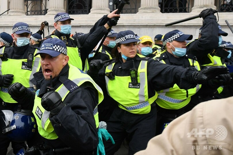 ロンドン警視庁はツイッター(Twitter)の投稿で、広場に集まった参加者1万人以上を解散させようと警官隊が出動し、衝突が起きたと説明。参加者らはコロナ対策の制限措置を順守していなかったという。