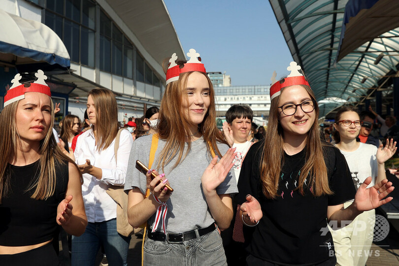 参加者の中には著名なスポーツ選手やドラム奏者、合唱団の姿もあり、数万人がミンスク市内を行進。厚紙で作った王冠をかぶって参加する人たちもいた。