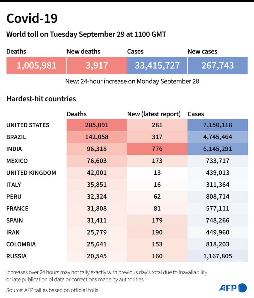 【9月30日 AFP】AFPが各国当局の発表に基づき日本時間29日午後8時にまとめた統計によると、世界の新型コロナウイルスによる死者数は100万5981人に増加した。
