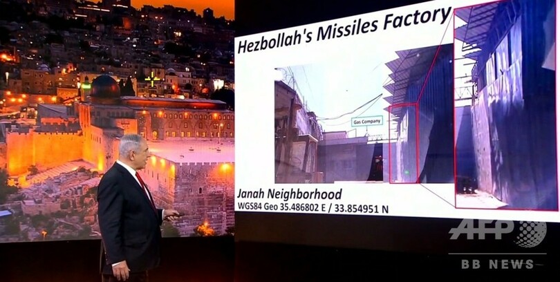 エルサレム(Jerusalem)からビデオ演説を行ったネタニヤフ氏は、ヒズボラが拠点としているベイルート南郊ジュナー(Jnah)に「秘密の武器庫」があるとして地図や画像を示した。