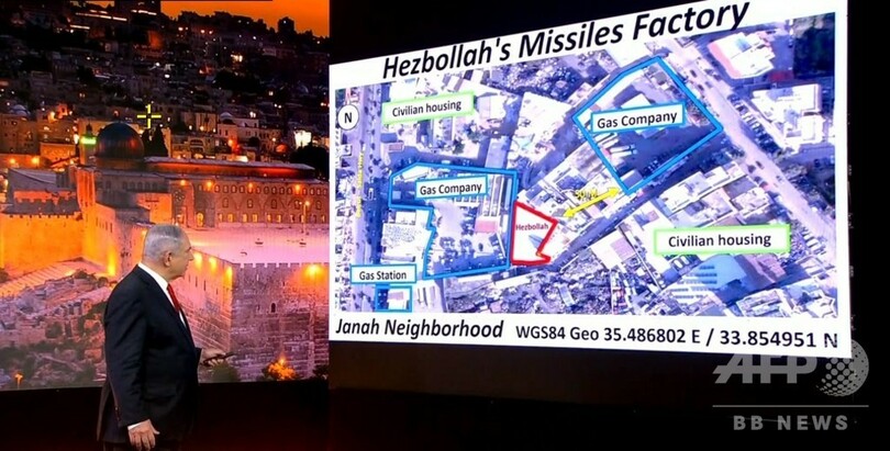 エルサレム(Jerusalem)からビデオ演説を行ったネタニヤフ氏は、ヒズボラが拠点としているベイルート南郊ジュナー(Jnah)に「秘密の武器庫」があるとして地図や画像を示した。