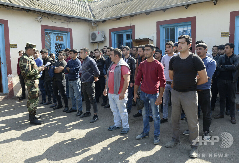 アルメニアの首都エレバンでは、戦闘に加わろうと、数十人の男性が徴兵事務所前に集まった。工場労働者(32)は、「侵略者から祖国を守るため、行動しなければならない」「ここはわれわれの土地だ。捨てるくらいなら死ぬ」と語った。(c)AFP