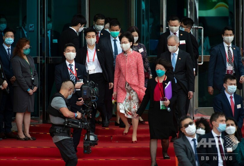 林鄭行政長官と中国本土の政権高官らは1日朝、安全柵に囲まれた会場での式典に出席した。中国と香港の旗をたなびかせたヘリコプター数機が港湾地区の上空を飛行し警察が取り囲む中、林鄭氏は演説で、「わが国の国家安全は香港で保護されており、われわれの市民は法に従い再び自らの権利と自由を行使することができる」と表明した。(c)AFP/Yan ZHAO, Jerome TAYLOR