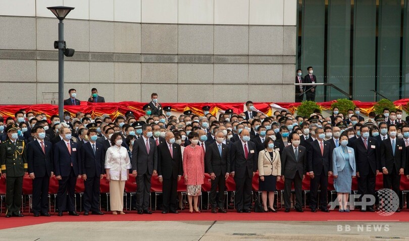 林鄭行政長官と中国本土の政権高官らは1日朝、安全柵に囲まれた会場での式典に出席した。中国と香港の旗をたなびかせたヘリコプター数機が港湾地区の上空を飛行し警察が取り囲む中、林鄭氏は演説で、「わが国の国家安全は香港で保護されており、われわれの市民は法に従い再び自らの権利と自由を行使することができる」と表明した。(c)AFP/Yan ZHAO, Jerome TAYLOR