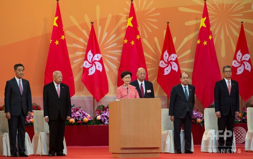 林鄭行政長官と中国本土の政権高官らは1日朝、安全柵に囲まれた会場での式典に出席した。中国と香港の旗をたなびかせたヘリコプター数機が港湾地区の上空を飛行し警察が取り囲む中、林鄭氏は演説で、「わが国の国家安全は香港で保護されており、われわれの市民は法に従い再び自らの権利と自由を行使することができる」と表明した。(c)AFP/Yan ZHAO, Jerome TAYLOR