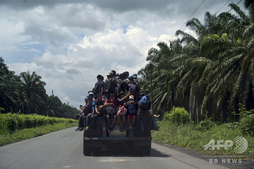 移民ら数十人は、ヒッチハイクをして大型の平床トラックの後部に乗り込み、メキシコに向かった。