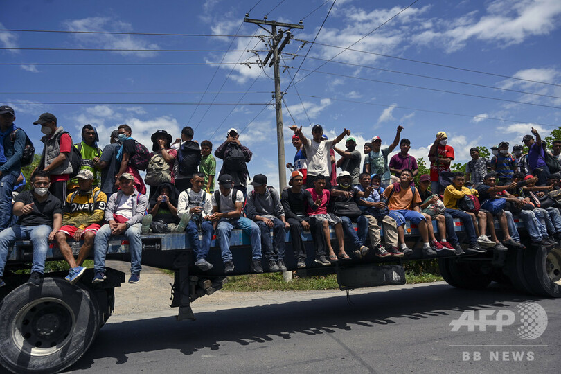移民ら数十人は、ヒッチハイクをして大型の平床トラックの後部に乗り込み、メキシコに向かった。