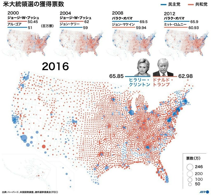 ニュース 政治・経済 図解 米大統領選2020 【図解】米大統領選、州別勝敗結果(1984~2016年) 2020年10月4日 13:00 発信地:米国 [ 北米 ] このニュースをシェア ‹ › ❮ 2/8 ❯ 2000年以降の米大統領選での歴代候補の獲得票数を郡別に示した図。(c)SOPHIE RAMIS, PATRICIO ARANA / AFP 画像作成中 ! 【10月4日 AFP】1984年から2016年までの米大統領選の州別勝敗結果を図解でまとめた。(c)AFP 特集:米大統領選2020 2020年11月3日、米大統領選挙の投開票が行われ、民主党のジョー・バイデン前副大統領が勝利を確実にした。 政治・経済 一覧へ> メディア・報道関係・法人の方向け 写真・動画 購入のお問合せ>
