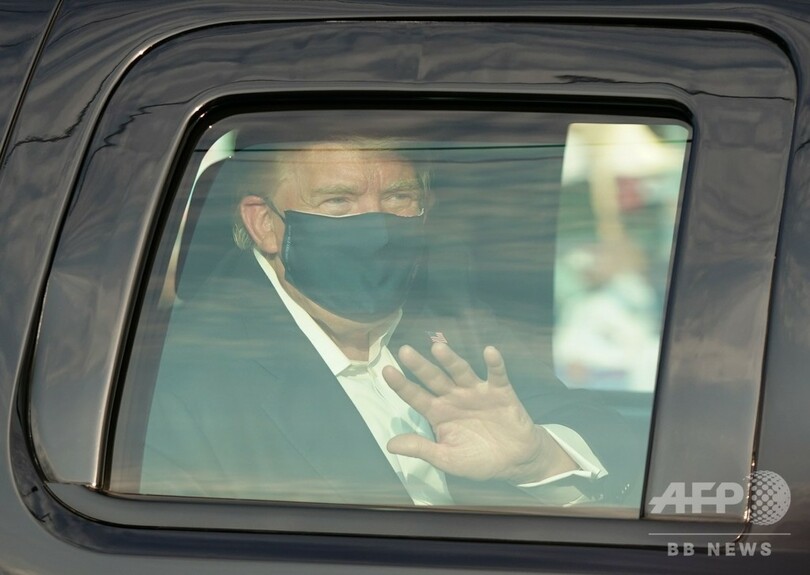 【10月5日 AFP】(更新)ドナルド・トランプ(Donald Trump)米大統領は4日、車に乗って新型コロナウイルス感染症(COVID-19)の治療を受けている病院の外に姿を現し、集まった支持者に手を振って応えた。トランプ氏はこれに先立ち、支持者を「電撃訪問」するとツイッター(Twitter)に投稿していた。