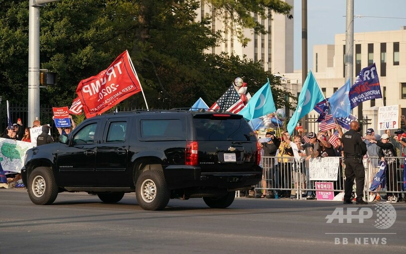 【10月5日 AFP】(更新)ドナルド・トランプ(Donald Trump)米大統領は4日、車に乗って新型コロナウイルス感染症(COVID-19)の治療を受けている病院の外に姿を現し、集まった支持者に手を振って応えた。トランプ氏はこれに先立ち、支持者を「電撃訪問」するとツイッター(Twitter)に投稿していた。